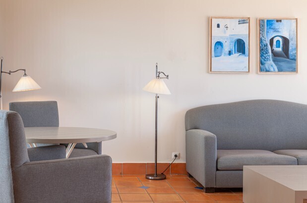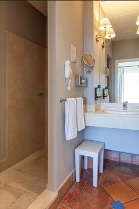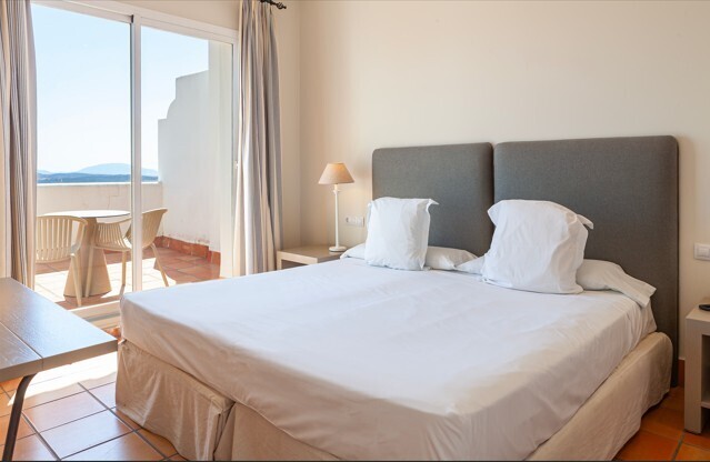 Suites with terrace or porch and views of La Janda Valley or the Golf Course. These rooms have a living room and a bedroom. They are equipped with a direct line telephone, high-speed wi-fi, independent air conditioning, mini-bar, coffee maker, flat-screen TV, safe, and a full bathroom with bathtub, shower, hairdryer, and coffee/tea service.